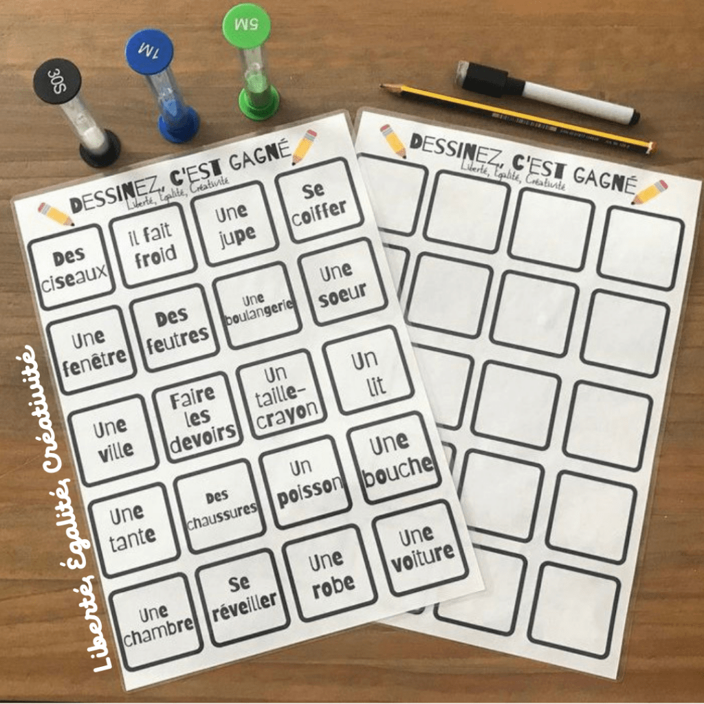 Partimos de una organización por pareja. En una primera parte, dibujan en la plantilla dada, ilustrando las palabras indicadas. Para ello, activamos el cronómetro y les animamos a que levanten sus manos cuando finalicen al grito de «dessinez, c’est gagné».