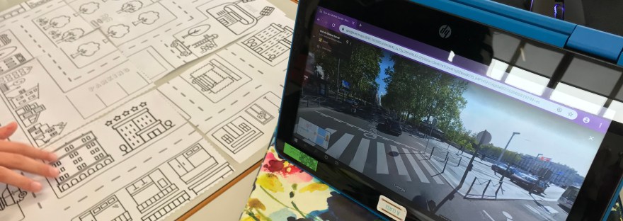 Otra parte del proyecto se apoyaba directamente en Google Maps. Caminaban virtualmente por sus calles y plasmaban esta realidad en estos planos coloreables que presentan en las fotos. Modificaban una ciudad X ahí representándola en la ciudad de Lyon, trabajando así vocabulario de la ciudad.