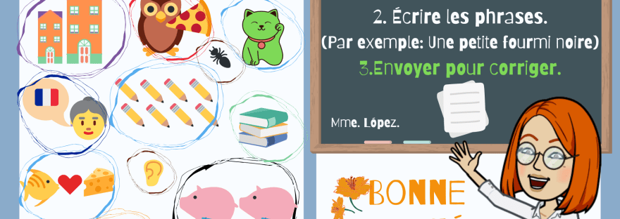 Para entender qué era eso de “y’en a une qui est en trop” hemos hecho un juego después de la canción utilizando las pizarritas. Yo proyectaba diapositivas de cuatro imágenes, donde una de ellas se diferencia de las demás por ser masculino, femenino, plural…Así ha sido como hemos recordado el vocabulario que aparecía, levantando nuestra pizarra con la opción que sobraba. 🏫